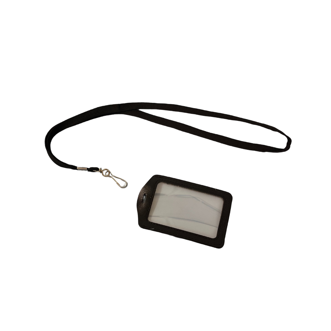 Kortholder i kunstskinn med snor. Kortholderen har plast vindu på begge sider. 5 pk.